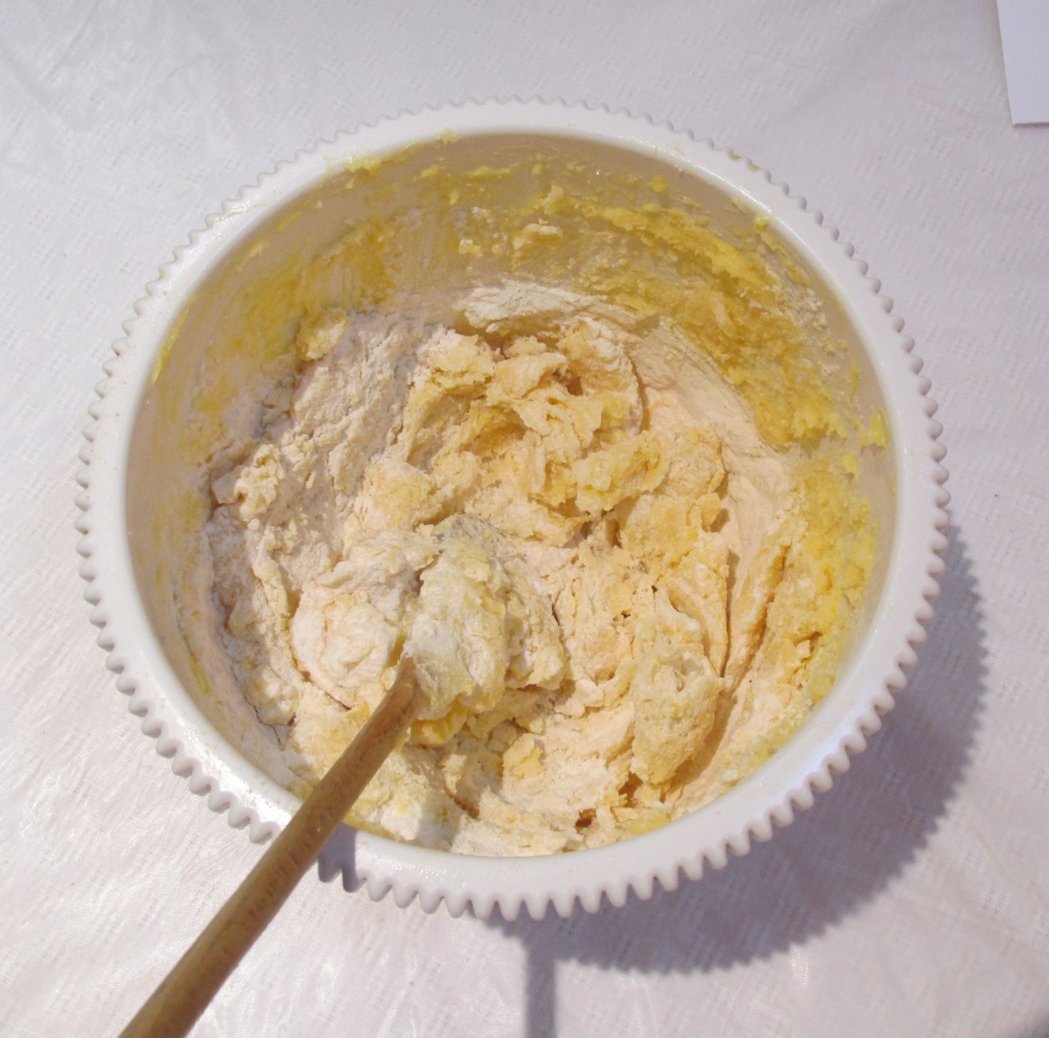 Add flour: Add the flour and mix with the wooden spoon until the mixture thickens.